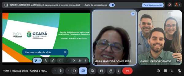 Participaram da reunião: Paíta Façanha (Coordenadora COEGE), Gabriel Gregório Matos (servidor da COEGE), Giselle Frota (Diretora de Planejamento Estratégico de Maracanaú) e Janyo Barbosa (Diretor de Planejamento de Maracanaú).
